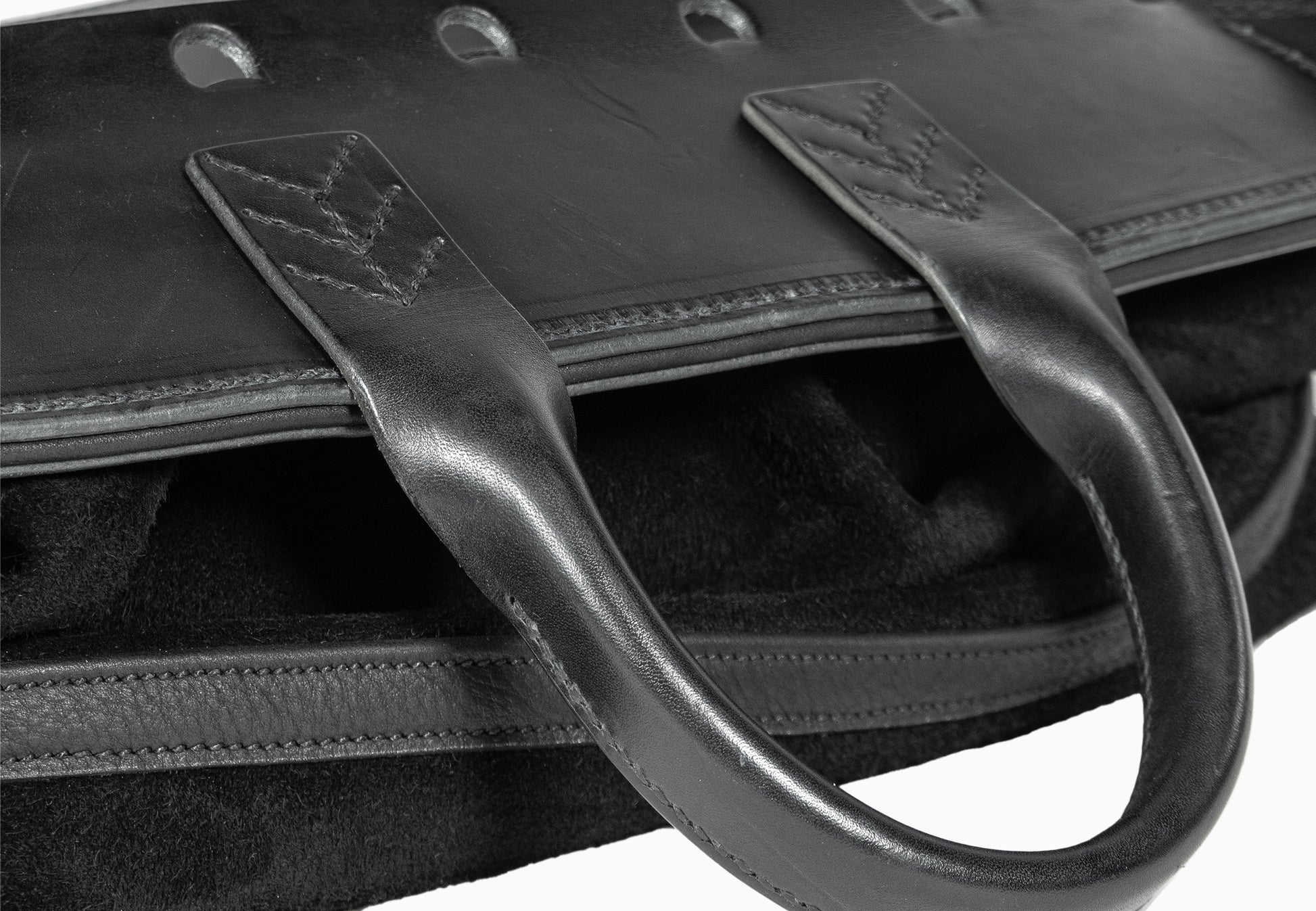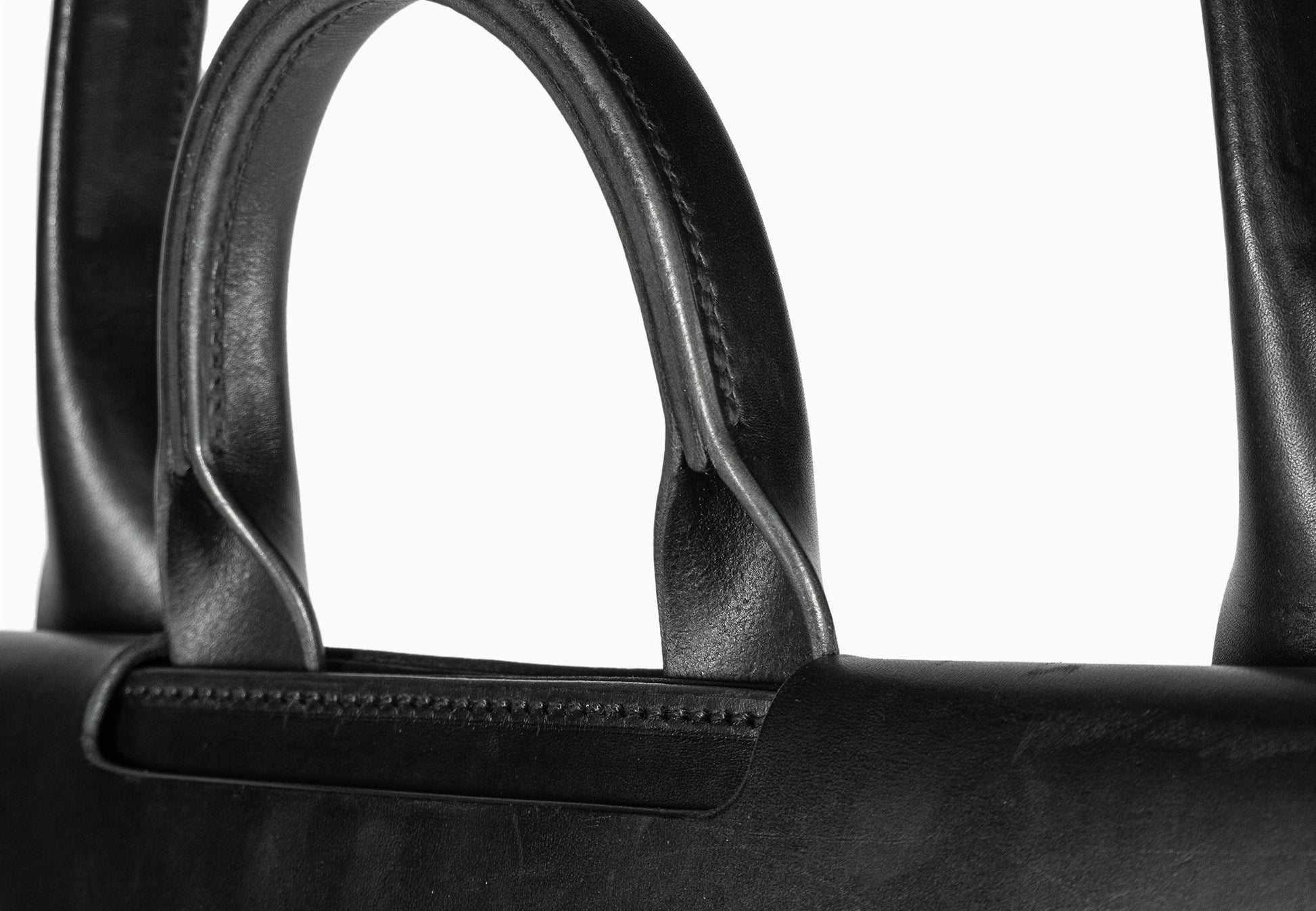 Prototype bag made from vegetable-tanned leather, assembled with a combination of hand stitching and machine stitching.